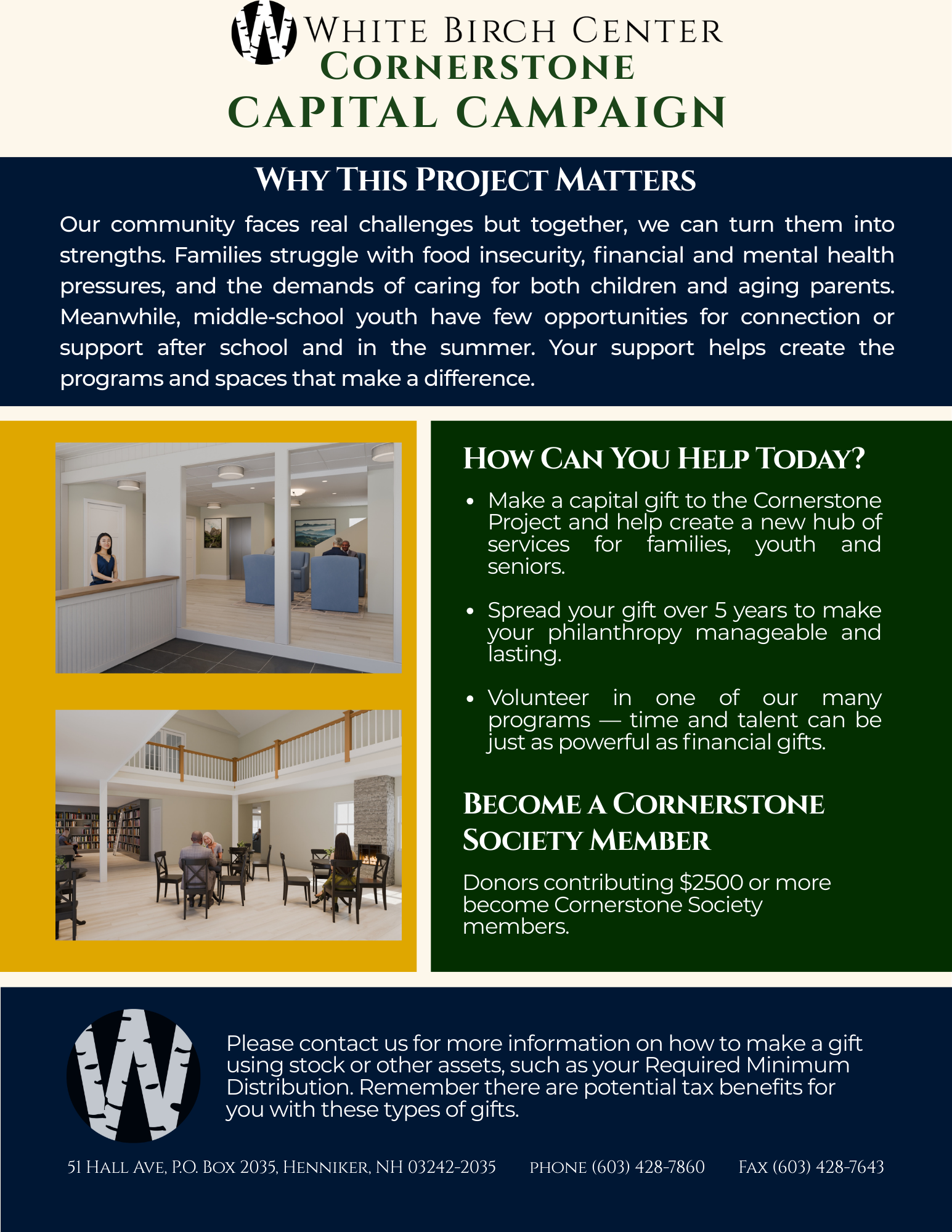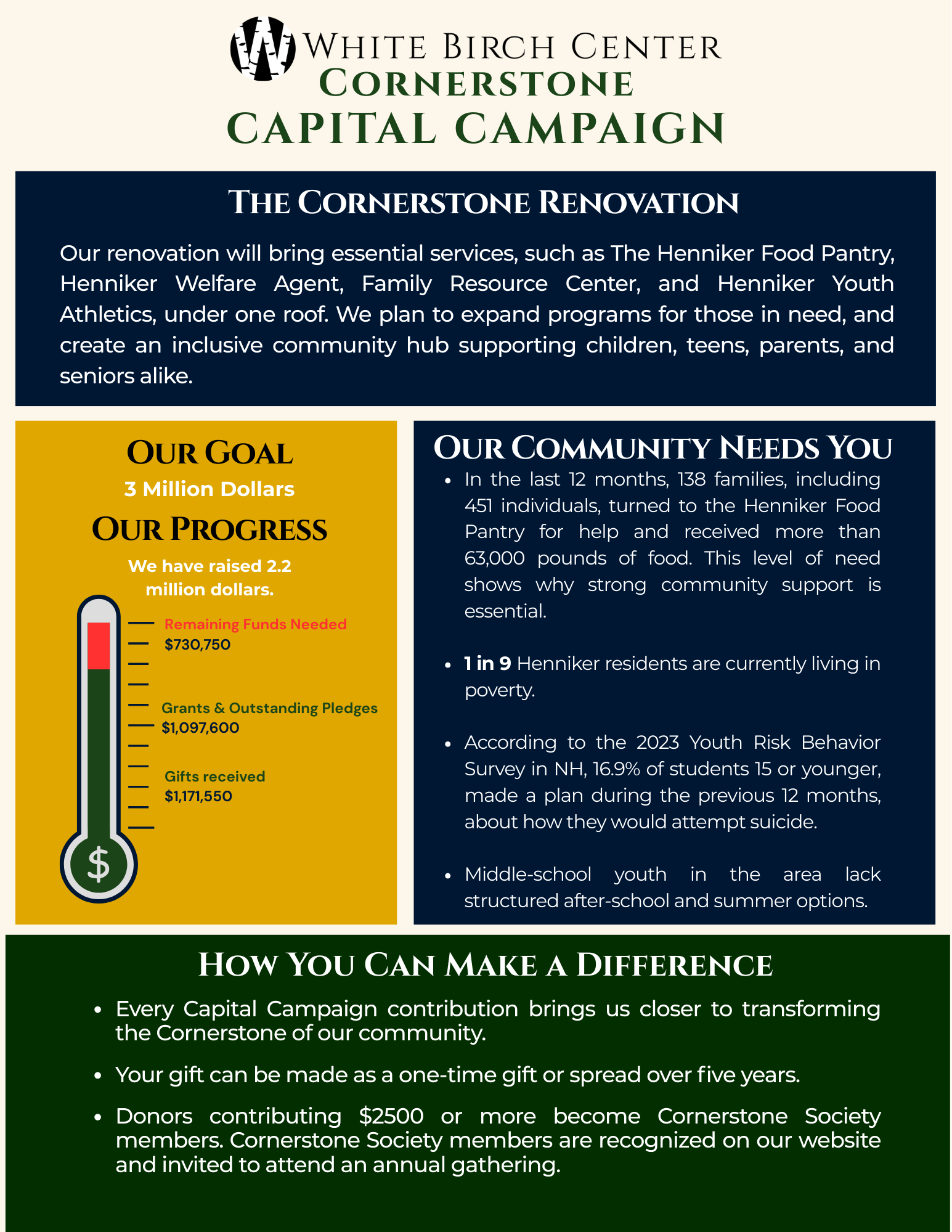 The Cornerstone Building renovation will bring essential services, such as The Henniker Food Pantry, Henniker Welfare Agent, Family Resource Center, and Henniker Youth Athletics, under one roof. We plan to expand programs for those in need, and create an inclusive community hub supporting children, teens, parents, and seniors alike.